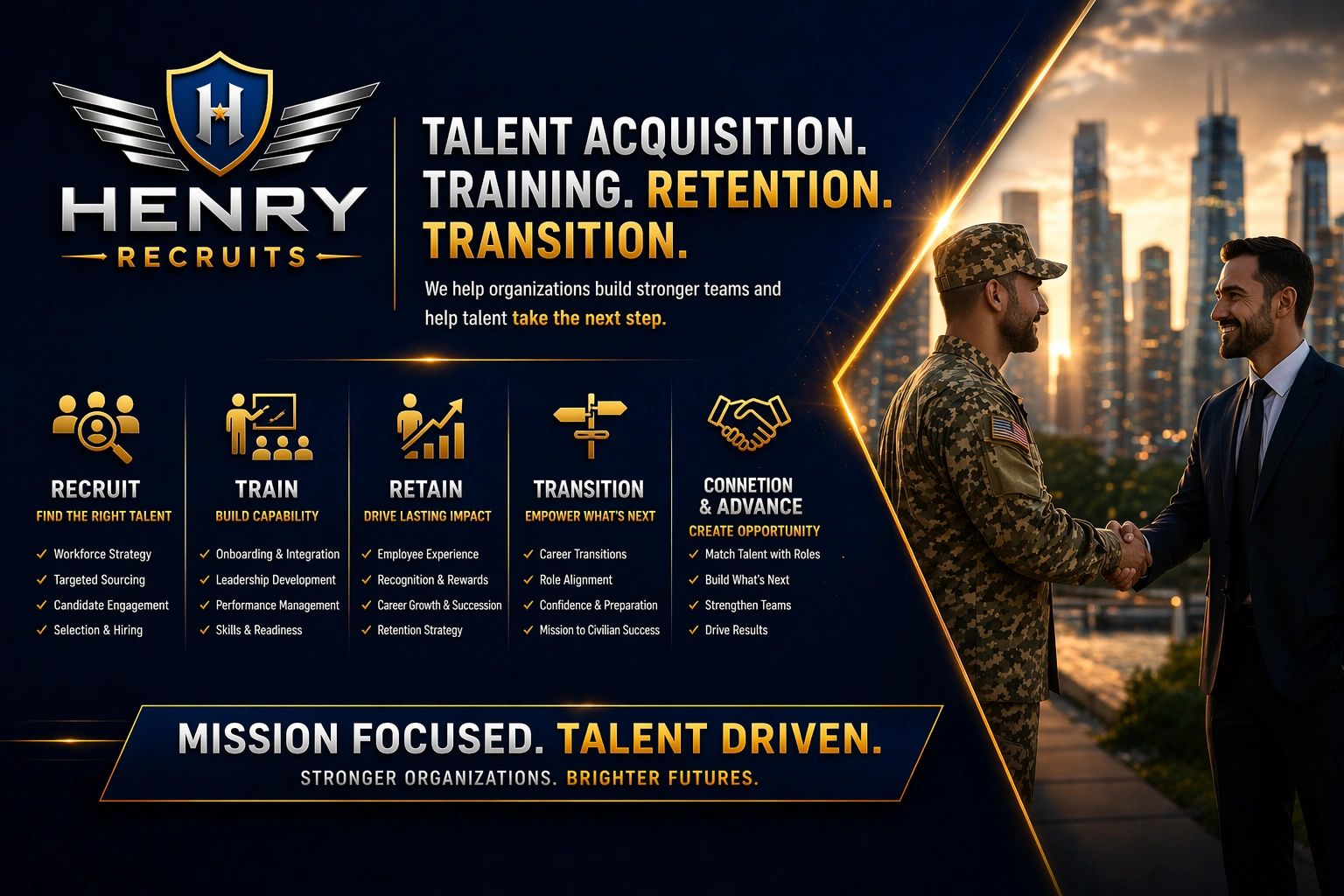 Henry Recruits is also deeply committed to supporting veteran career transitions. We specialize in helping military professionals translate their experience into meaningful civilian careers. Through personalized coaching, strategic positioning, and mentorship, we guide veterans as they navigate the transition from service to corporate success.
